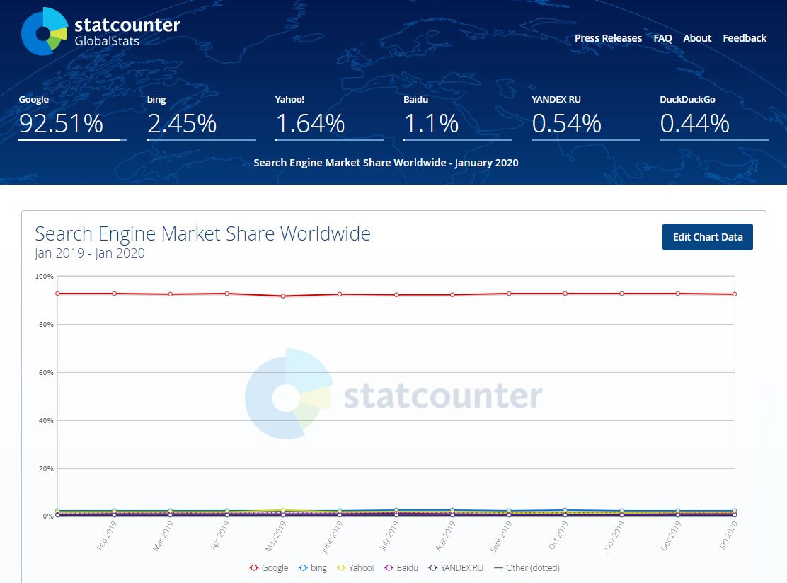 Sí, vale, están ahí, existen, pero si nos remitimos a las estadísticas más recientes publicadas en Statcounter podemos ver que Google se lleva la palma con un increíble 92,51% seguido muy, pero que muy de lejos, por Bing (2,45%) y Yahoo (1,64%).